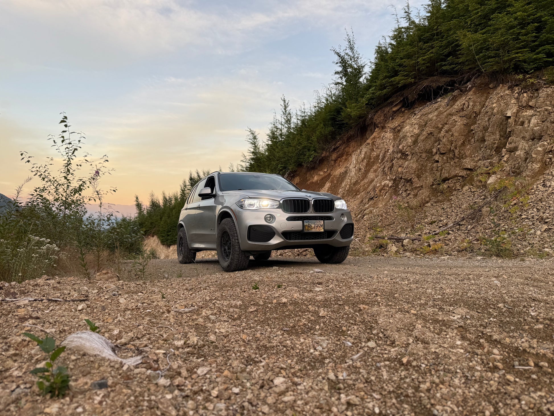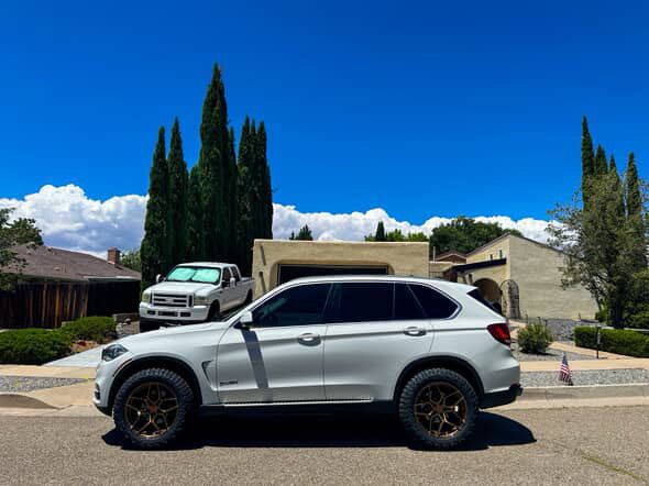 The pictured F15 X5 is equipped with factory air suspension, M adaptive shocks, and auto leveling headlights all working as per factory while sitting 1.5" taller on 17" wheels with 265/70R17 Nitto Terra Grappler G2 tires.